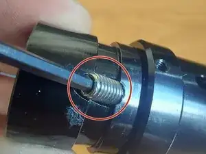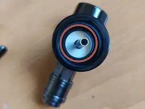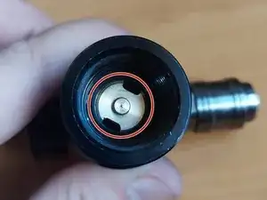 Используйте силиконовую смазку (не на основе бензина), чтобы смазать уплотнительное кольцо на трубке и маленькое кольцо снизу. В этом регуляторе всего 2 уплотнительных кольца.