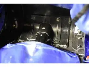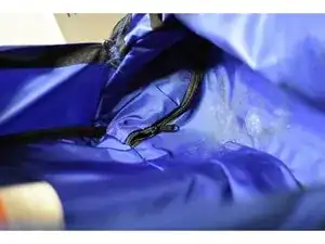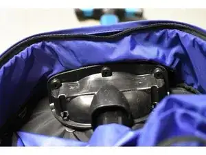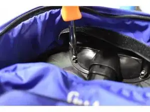 Откройте липучку в верхней внутренней части рюкзака. Вы найдёте пять винтов — два, обращённых к задней стороне рюкзака, и три, обращённых вверх. Снимите их.