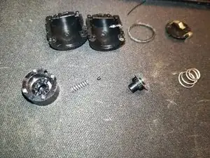 Аккуратно извлеките внутренние пружины и толкатели. На фото один маленький толкатель всё ещё находится в верхней части кнопки.