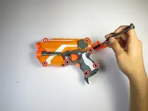 Удалите семь чёрных винтов Philips диаметром 10 мм из корпуса бластера с помощью отвёртки Phillips #1.