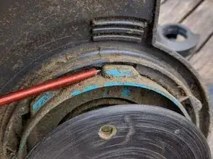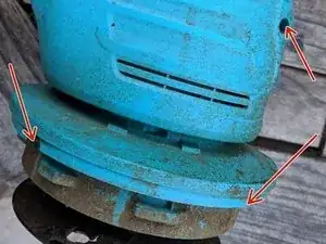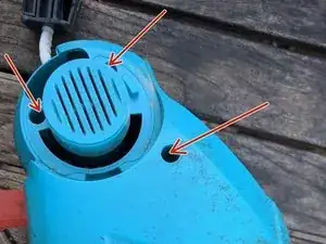 Снимите чёрную защиту от травы. Для этого поверните её. Поворот блокируется в двух местах, которые можно нажать тонкой отвёрткой.