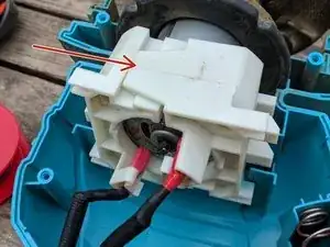 Вытяните белый блок и двигатель. Затем разделите белый блок на две части, потянув за место, указанное стрелкой на изображении.