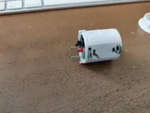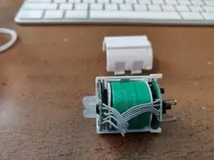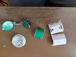 Снимается нижняя часть, затем боковины защёлкиваются и раскрывают две печатные платы, соединённые пятью проводами, и батарею, припаянную к каждой плате. В основании находятся две пружины, соединяющие контактную пластину для зарядки и кнопку. Кнопка, вероятно, выпадет. Корпус также может разойтись внутри игрушки при падении; я приклеил его при повторной сборке.