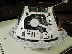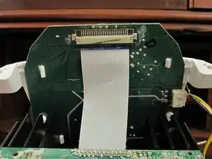 Удалите три винта у основания белого пластикового держателя, который защёлкнут в основной плате. Плата теперь приподнимется, но её удерживает ленточный кабель.