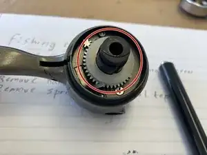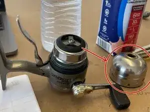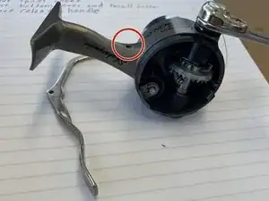 Удалите указанную кружком пружину при помощи плоской отвёртки или небольших плоскогубцев. После этого съёмная часть шпули выпадет. Также открутите ручку катушки (её используют для намотки лески).