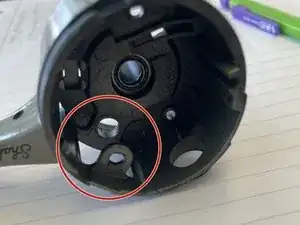 Снимите ручку освобождения. В указанном кружком месте находится маленький штифт. Его необходимо выбить тонкой отвёрткой и молотком. После этого ручка легко выскользнет.