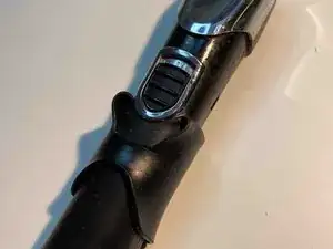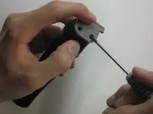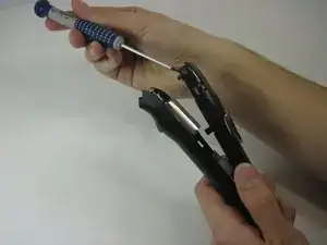Начните с удаления резиновой накладки вдоль ручки. Это можно сделать, используя ноготь, поддеватель или подобный инструмент, чтобы приподнять верхние края с обеих сторон достаточно, чтобы схватить их и потянуть вниз, по сути, выворачивая ее наизнанку, как вы могли бы сделать с тугой, влажной ноской.