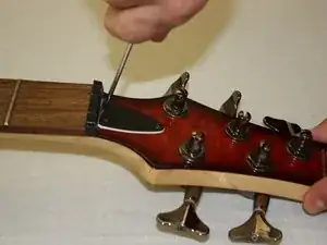 Анкерный стержень можно заменять как со снятыми, так и с натянутыми струнами. Из‑за громоздкости шестигранного ключа в этом руководстве показано, как регулировать анкерный стержень со снятыми струнами. После снятия струн гриф начнёт слегка изгибаться вверх или вниз. Это определит, насколько нужно будет отрегулировать анкерный стержень.
