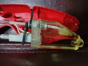 Снимите баллон и механизм спуска, не нагружая провода. Обратите внимание на чёрный рычаг регулятора газа сверху газовой магистрали и чёрную тягу под газовой магистралью.