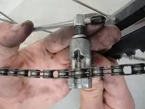 Совместите толкатель инструмента с шарниром цепи и затяните инструмент до тех пор, пока штифт не выступит с другой стороны, но не выйдет полностью.