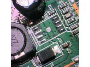 Прикрепите новую микросхему (правильная ориентация: здесь точка слева, где находится катушка с маркировкой '220'). Затем используйте флюс и припой, чтобы припаять оставшиеся выводы.