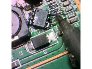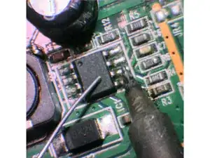 Ниже описаны шаги по замене микросхемы с помощью паяльника. Для лучшего результата нужна качественная станция с терморегуляцией и тонким, но не слишком тонким жалом. Пайка проводом диаметром около 0,5 мм, оплеткой для выпаивания и флюсом. Канифольный флюс обязателен, так как он обеспечивает хорошее течение припоя после испарения флюса внутри проволоки.