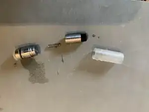 Чтобы разобрать клапан, аккуратно потяните металлический цилиндр, чтобы сдвинуть его с пластикового цилиндра. Внутри есть ещё одна пружина, будьте к этому готовы.
