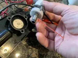 Осторожно приподнимите узел от основания, чтобы открыть доступ к клапану. Тот маленький серебристый цилиндр — и есть клапан. Под ним находится пружина, поэтому он может выпрыгнуть (красная стрелка).