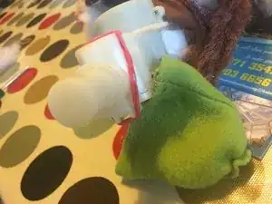 У Гизмо простой мотор, связывающий голову и тело. Он покрыт зелёной крышкой, приклеенной не очень прочным клеем. Снимите её, чтобы добраться до механизма. Как видно, у моего Гизмо пластиковая деталь, соединяющая голову и тело, была сломана.
