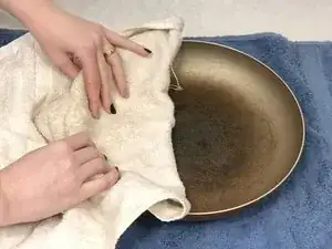 Положите сковороду на ровную ткань.