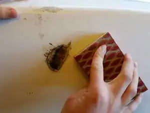 Начните со шлифовки обеих сторон поверхности вокруг отверстия грубой наждачной бумагой, пока крупные участки старого стеклопластика не станут ровными.