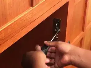 Один человек должен удерживать переднюю панель на месте, а другой — закрепить петли шурупами.