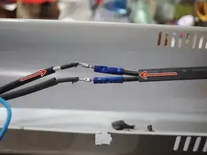 Разрежьте и снимите заводскую термоусадку, отрежьте повреждённый конец провода. Стрипуйте 1/4" или менее, чтобы длина оголённой жилы соответствовала клеммам. Подберите две маленькие термоусадки, которые наденутся на клеммы, и большую — на весь сплайс. Разместите термоусадки на проводах и обожмите клеммы.