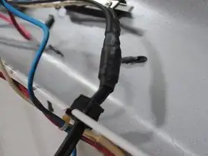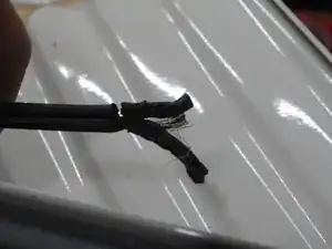 Провод теперь исправлен. Вставьте верхнюю часть крышки в загнутые кромки внизу и аккуратно сдвиньте её до верха. Установите меньший винт в центральное отверстие, затем прикрутите пластиковую ножку двумя большими винтами. Готово.