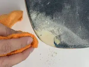 Нанесите быстросохнущую жидкость на хлопковую тряпку и промокните смоченной частью поврежденную поверхность для очистки.