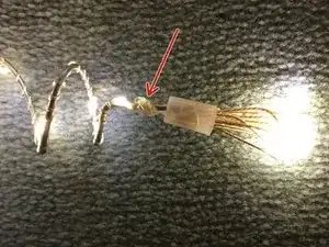 Красная стрелка показывает место электрического замыкания, где верхняя группа светодиодов припаена (два провода) к светодиодной цепи на спиралях.
