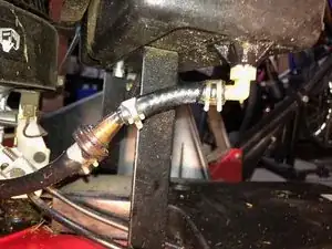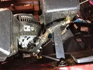 Более тщательный осмотр показывает, что топливопровод выглядит влажным, начиная от основания бака. К топливопроводу прилипла травяная стружка. Утечка здесь.