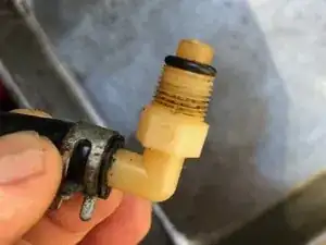 Топливо проходит мимо смятого уплотнительного кольца, протекает через резьбу и стекает по внешней стороне топливопровода. Самый простой ремонт — заменить уплотнительное кольцо. У меня нашлись кольца подходящего размера, но я не уверен, выполнены ли они из специального этанолостойкого материала.