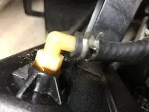 Протирание топливопровода показывает, что из дна пластикового топливного бака выходит белый пластиковый уголок. Хомуты крепят чёрный пластиковый топливный шланг к уголку и к топливному фильтру.