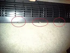 Затем аккуратно снимите крышку. С правой стороны, вероятно, будут язычки, удерживающие её на месте (обведено на третьем снимке). Вам нужно будет нажать на крышку в этих местах, чтобы язычки выскочили. Будьте терпеливы и осторожны, и в конечном итоге крышка снимется.