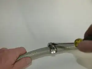 Совместите хомут так, чтобы на стороне разреза оставалась часть шланга, выступающая наружу, при этом хомут должен находиться в пределах конца муфты.