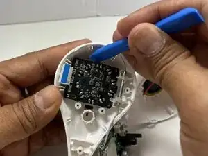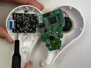 Используйте открывалку или лопатку, чтобы поднять материнскую плату от верхнего корпуса и осторожно установить её на другую половину корпуса, чтобы получить доступ к камере.