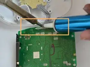 После того, как устройство будет разъединено, материнская плата станет видимой, на ней находятся два винта с головкой Philips на 4 мм, расположенные ближе к верхней части, и 4 провода, ведущие к плате, скрытой под материнской платой.