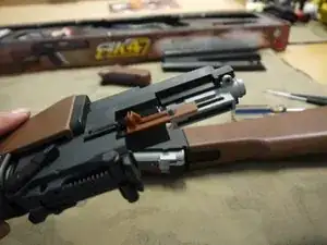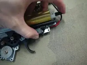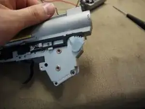 Вставьте редуктор обратно в приемник, начиная с задней проводки. После того как проводка окажется в прикладе, протяните каркас мотора через отверстие для рукояти.