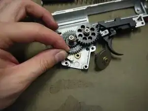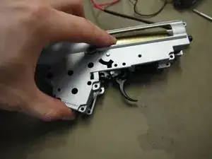 После закрытия редуктора осмотрите его, чтобы убедиться, что все элементы правильно сели и между половинами нет зазора. Установите винты и черную крышку за спусковым крючком.