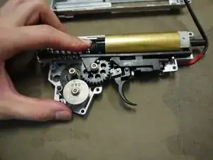 Осторожно установите пружину поршня и направляющую пружины. Убедитесь, что направляющая зафиксирована в пазах редуктора и что поршень правильно сидит на направляющих.