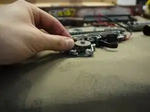 Установите шестерню селектора с левой стороны, убедившись в совмещении зубьев с зубьями на черной пластине селектора. Прикрепите правую шестерню к валу и замените винт, который её фиксирует.