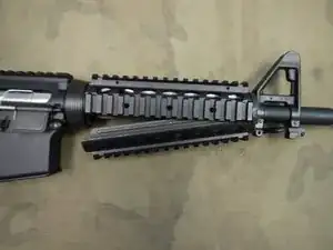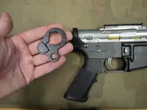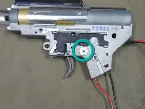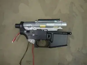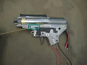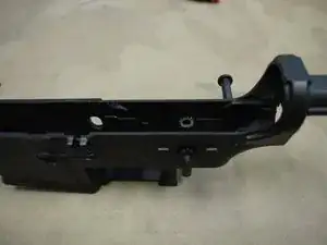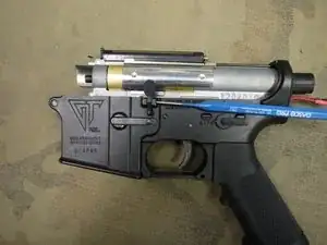 Теперь можно установить затворную рукоятку и пружину на верхнюю часть коробки передач.
