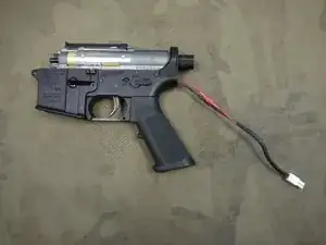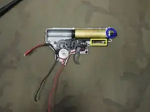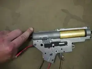 Найдите символ «+» на верхней части мотора. Он обозначает положительную клемму рядом с ним и должен быть направлен к передней части оружия, как показано, при установке в рукоятку.