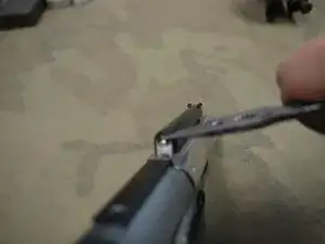 Возьмите кнопку выпуска магазина и пружину. Начните вдавливать её в ресивер.