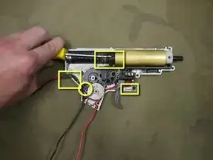 Проверьте, прикреплена ли пружина переключателя к штифту на корпусе редуктора и к толкателю спускового крючка.