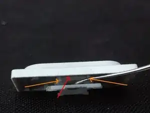 Лучший способ — вставить модифицированную лопатку под внутреннюю часть клавиши и над ножничным держателем точно в том месте, куда указывает красная стрелка (не вставляйте инструмент там, где показан зубочисткой).