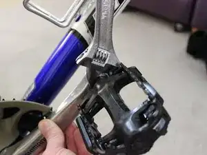 Поверните ключ против часовой стрелки, чтобы unscrew правую педаль (со стороны цепи).