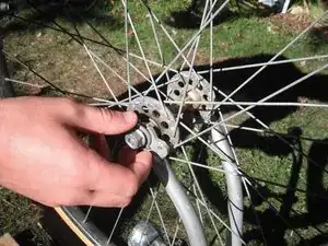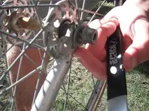 Используйте ключ, чтобы ослабить гайку, удерживающую ось колеса с одной стороны.