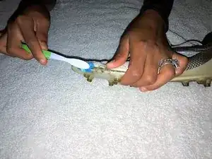 С помощью зубной щётки очистите всю бутсу, особенно в месте, где обувь порвана.