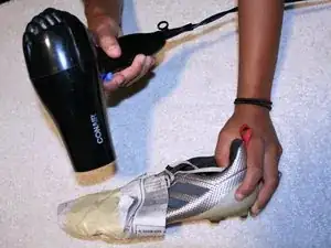 Используйте фен, чтобы медленно согреть газету вокруг разрыва. Делайте это в течение 10 минут, затем дайте обуви отдохнуть.