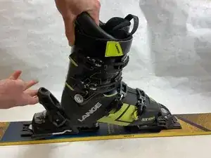 Нажмите вниз на ботинок, пока он не защёлкнется в креплении. При необходимости вы можете поднять рычаг на пятничном блоке, чтобы облегчить операцию.