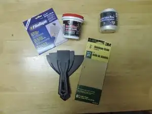 Для этой починки вам понадобятся (слева направо): клеящаяся заплатка для стен, шпаклёвка, бечёвка, шпатель и наждачная бумага.