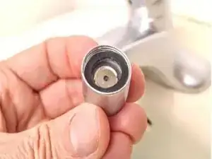 Аккуратно вставьте новый аэратор в муфту, убедившись, что сетчатая часть обращена вниз. Плотно введите аэратор в муфту для обеспечения надежной посадки.