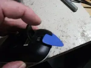 Начните поднимать за счетной задней крышки, вставив пластиковую лопатку для гитары/открывалку для телефона между корпусом и крышкой, начиная с области зарядного порта. Проведите ею по всей крышке, пока она не отделится. Вы будете слышать щелчки, это нормально — открываются небольшие замковые защёлки.